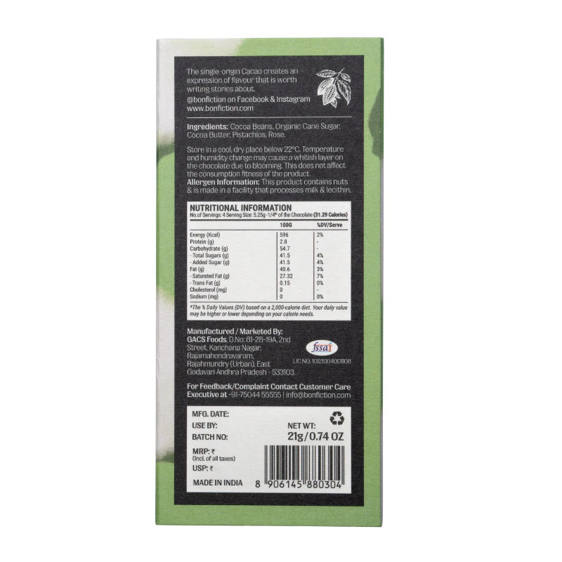 Bon Fiction - A Rose In Pistachio Skies - 55% Dark Rose Pistachio Chocolate (Mini)