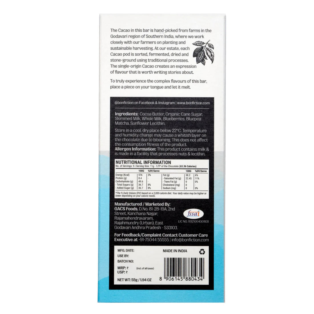 Bon Fiction - Matcha Prince and The Blue Pea - White chocolate with Blue pea tea and Blueberries